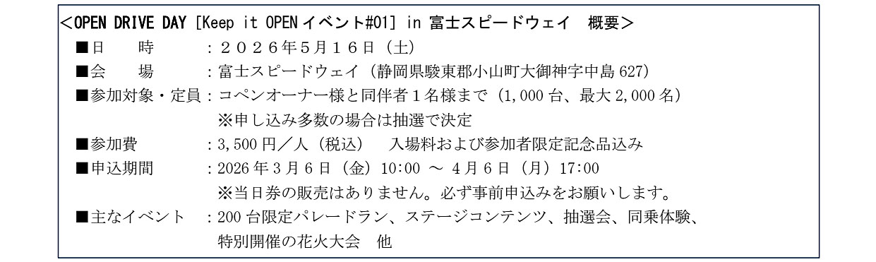 ダイハツは2026年3月6日、軽オープンスポーツカー「コペン」が2026年8月に現行モデルの生産を終了することに伴い、ユーザーへの感謝と、これまで築いてきたコペン・ファンとの絆を未来につなげ続ける決意と感謝の意を込め、スペシャルイベント「Keep it OPEN」を富士スピードウェイで開催すると発表した。