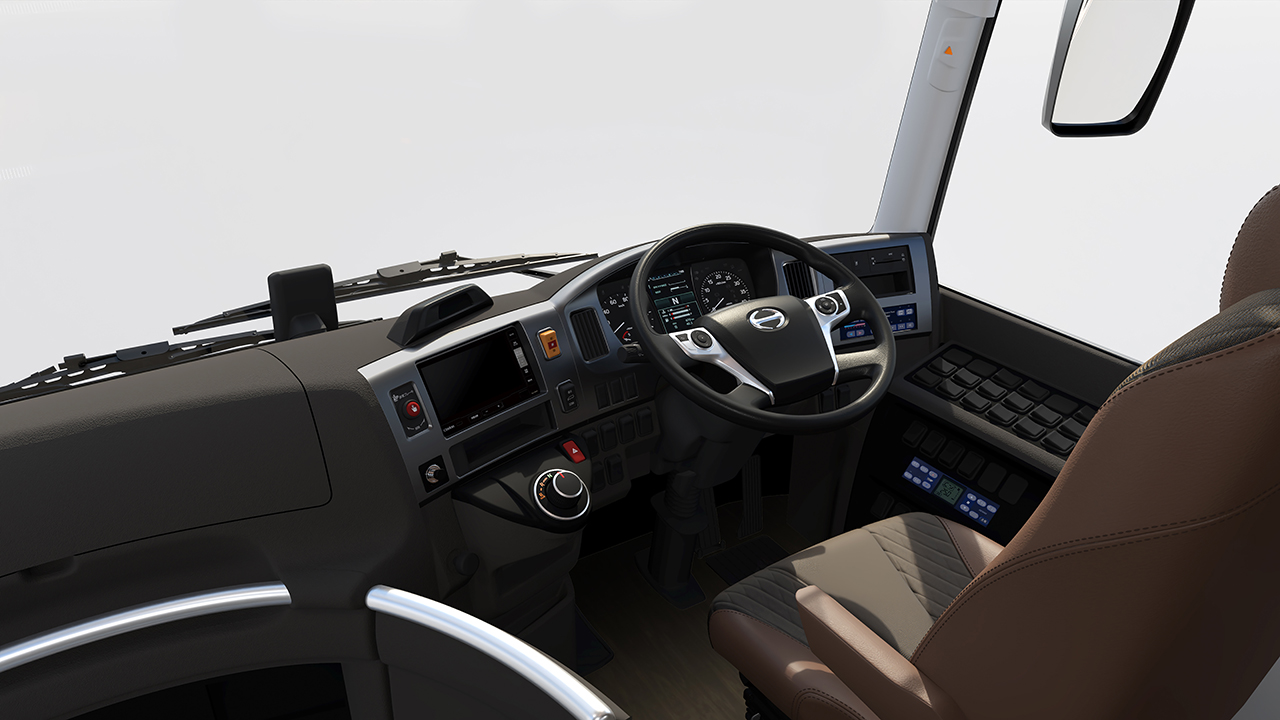 また、大幅な安全性能、デバイスのアップデートが行なわれており、夜間の視野確保に貢献するLEDヘッドライトや標識認識機能、出会い頭の衝突警報、左折巻き込み警報、車線変更警報などが追加。また流体式リターダを搭載し、下り坂などでのブレーキ性能向上をしている。