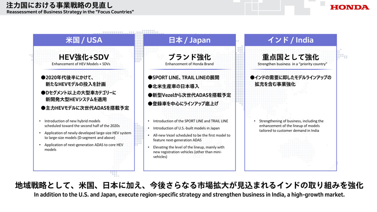 さらに三部社長は、「直近の市場環境についてこの数年間でわれわれの想定をはるかに上まわるスピードで大きく変化をしました。まず米国では環境規制の緩和が進み、EV補助金が廃止されたことで、市場成長のスピードが大きく鈍化しており、この傾向は当面継続するとみています。逆に中国ではEV市場は拡大したものの、競合他社の想定をはるかに上まわるスピードでの商品投入、電動化、知能化が進み、ASEAN市場においても、新興OEMの攻勢を受け、いずれも競争環境が激化しています。この競争環境の中で、ホンダは新興OEMなどと比較し、バリューフォーマネーのある製品を提供できず、競争力の低下を招きました。こういった変化に対して柔軟に対応できなかったこと、また関税影響により、エンジン搭載のハイブリッドモデルの収益が悪化したことなど、さまざまな要因により、4輪車事業は極めて厳しい収益状況に陥ったと認識しています」と説明した。