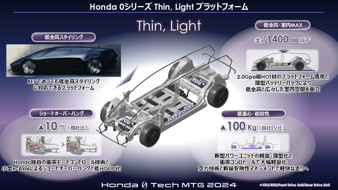 現在の自動車メーカーのEV戦略では、テスラに代表されるようなEVに特化、EV性能を極限まで追求する開発と、EVと内燃エンジン搭載を両立させる共存プラットフォーム開発というトレンドに大別できるが、ホンダはEVであることのメリット、性能を最大限追求するコンセプトを選択している。