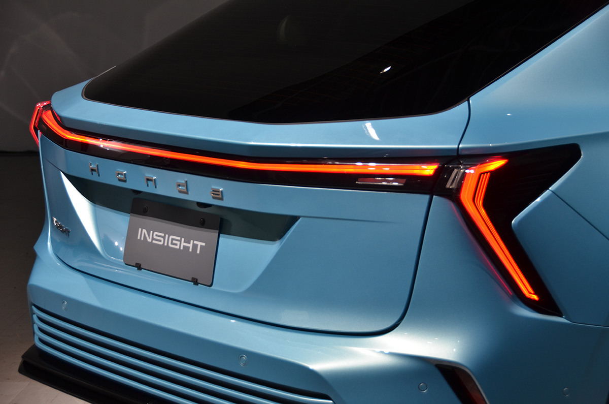 投入されるインサイトは「存在感際立つ個性的なEV」としており、エクステリアは、シャープな塊を前方に押しだすような突進感を与えた未来の乗り物を表現。シャープな造形とアイコニックな灯体表現と立体造形によって未来感を表現しているという。