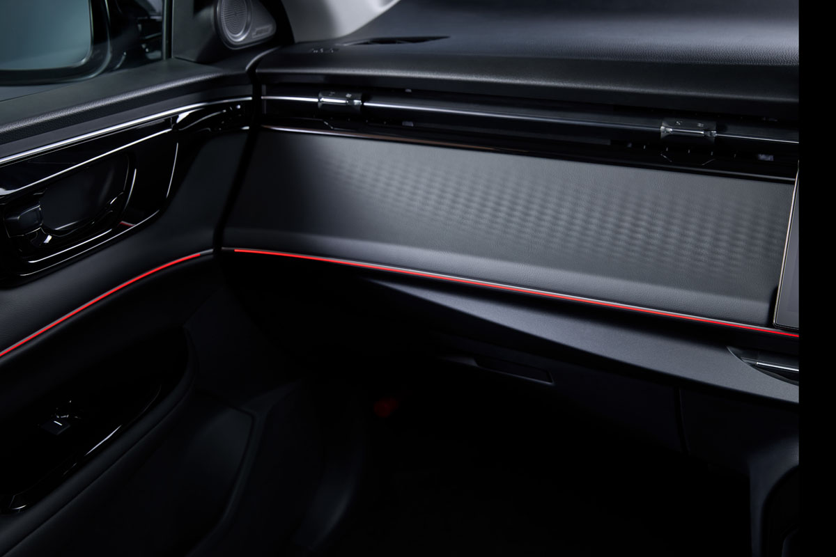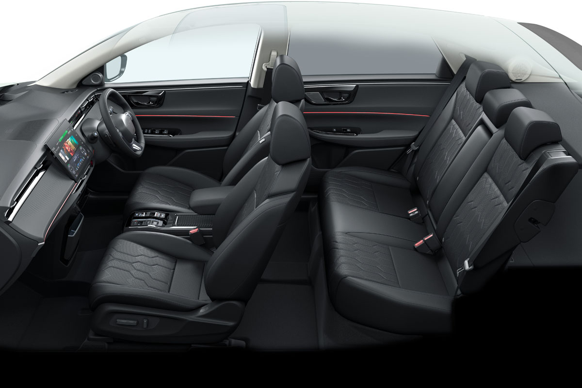 インテリアは、包み込むような造形と 室内全体の繋がりを意識したラウンドデザインに仕上げている。上質なソフトパッド素材を採用するとともに、インスツルメントパネルやドアの造形に沿ってLEDアンビエントランプを装備するなど質感を高め、どこに座っても心地よく、上質で一体感のある室内空間としている。