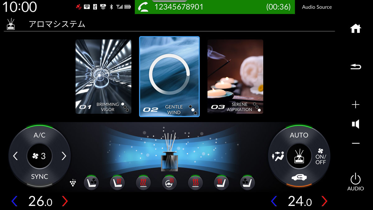エアコン作動時に室内に香りを広げるアロマディフューザーを採用。香りはディスプレイオーディオの画面から6種類のカートリッジ選択が可能。カートリッジは車内には最大3本まで装着できる。