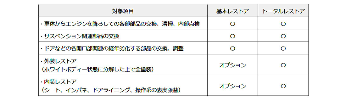 サービスメニューは、エンジンやサスペンション関連など、要望の多い運動性能に関わる項目をパッケージ化した「基本レストア」と、これに加えて外装と内装の施工、個体のコンディションに応じて、より細やかで総合的な作業を施す「トータルレストア」の2種類が展開される。