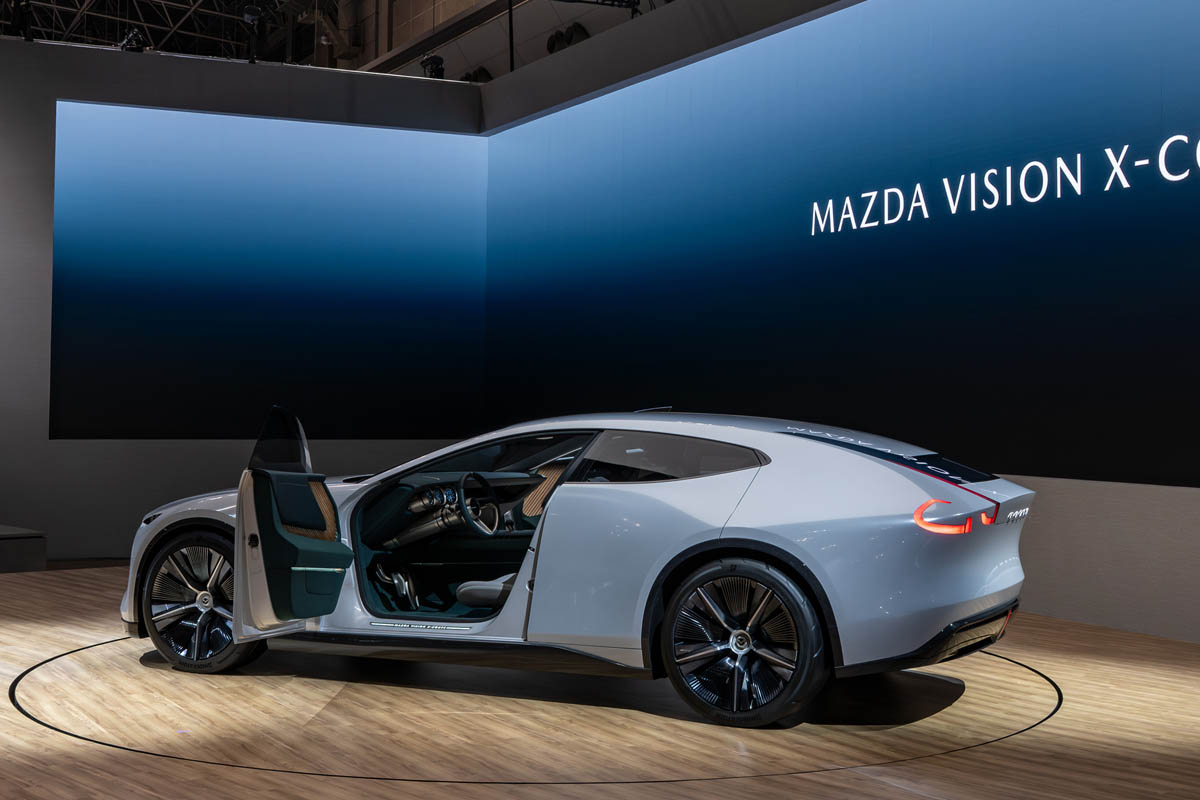 「VISION X-COUPE」は、魂動デザインをさらに進化させたクロスオーバークーペで、2ローターのロータリーターボエンジンとモーター、バッテリーを組み合わせたPHEVシステムを搭載している。したがって、高速巡航時はロータリーエンジンが駆動を担当する。