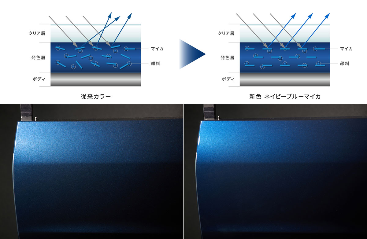 その実現手段として、「ハイレゾリューション化(高解像度化)」をテーマに開発を進め、緻密でクリアな色味や質感と明暗差を際立たせる高コントラストを両立するために、複数種類のマイカ(雲母の破片を混ぜた塗装を)をバランス良く配合した上で、水平に配置した。それにより、晴天、曇天などさまざまな環境でカラーがクルマの造形を際立たせることができる。