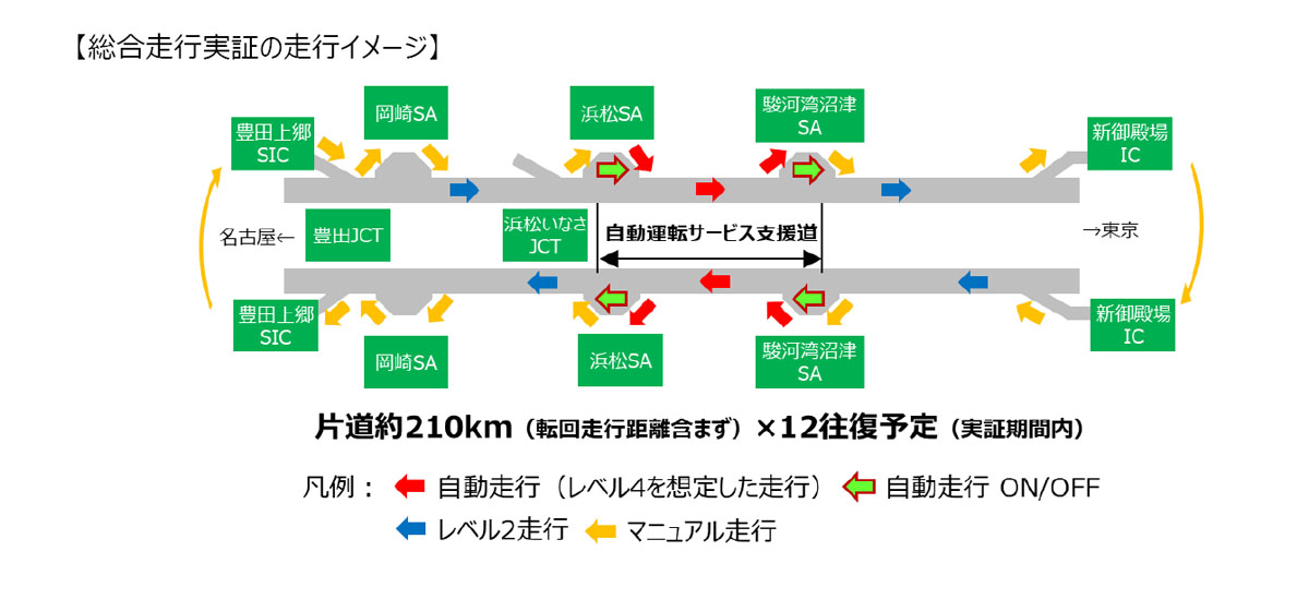 具体的には自動運転サービス支援道での「自動走行(レベル 4 を想定した走行)」およびその他区間での「レベル2走行」駿河湾沼津SAおよび浜松SAでの自動発着・合流支援による自動合流、路側機器による先読み情報支援による自動車線変更・自動速度調整、異常時対応を含む運行監視機能の評価を実施する。