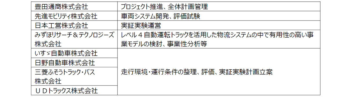 ドライバー不足などの社会課題解決に向け、受託者4社は、商用車メーカー4社および物流事業者をはじめとする関係者とともに、官民が一体となって 2026年度以降の幹線道路における自動運転トラックの社会実装を目指している。
