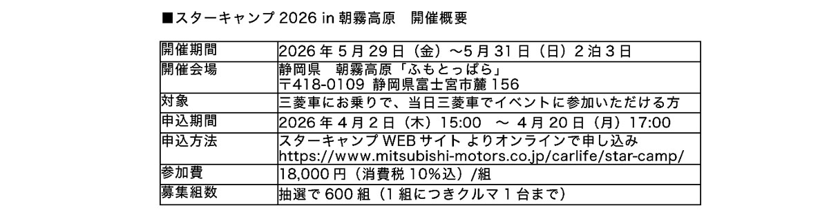 三菱自動車は2026年4月2日、恒例のオートキャンプイベント「スターキャンプ2026 in 朝霧高原」を5月29日(金)~31日(日)に、朝霧高原「ふもとっぱら」(静岡県富士宮市)で開催することを決定し、4月2日からスターキャンプ専用WEBサイトで参加者の募集を開始した。