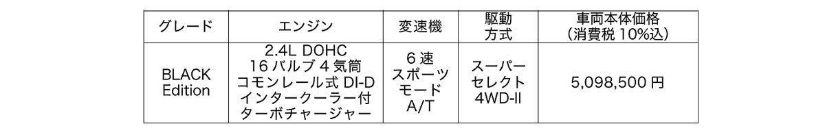 特別仕様車「BLACK Edition」は、エントリーグレードの「GLS」をベースにルーフレールを追加し、18インチ・アルミホイールやサイドステップ、その他のメッキ/シルバーパーツと併せてブラックに統一。