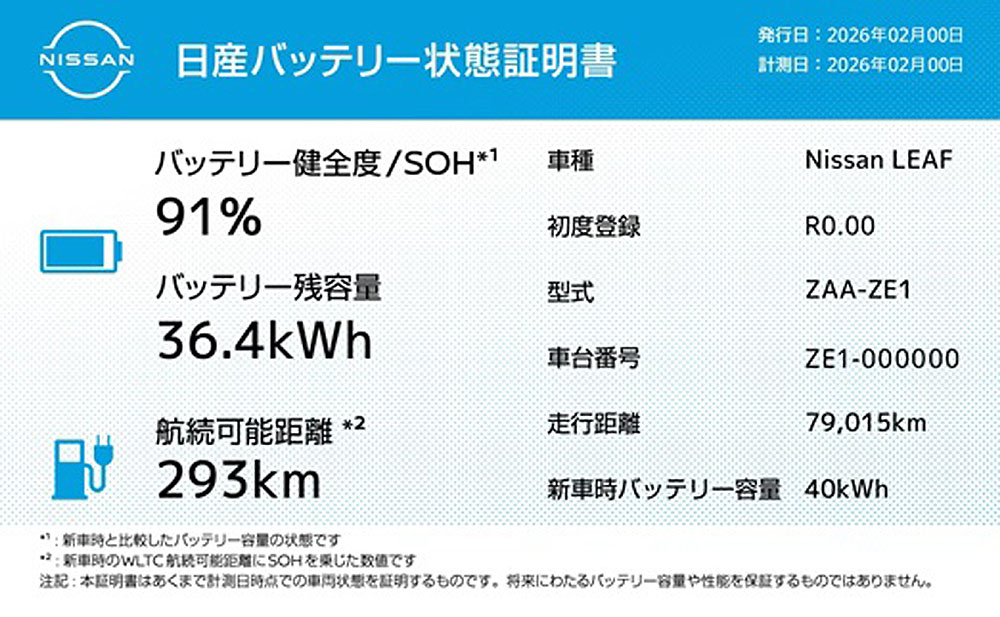 日産自動車は2026年2月27日、中古EVのバッテリー健全度(SOH:State Of Health)を証明する「日産バッテリー状態証明書」のトライアル運用を開始すると発表した。