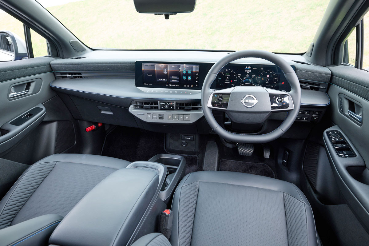 インテリアでは12.3インチの大型デュアルディスプレイを採用。Googleの各種機能・サービスに対応した「NissanConnectインフォテインメントシステム」を搭載しており、「Googleマップ」、「Googleアシスタント」、「Google Play」などの利用が可能。ナビゲーションシステムは、バッテリー残量に合わせて充電スポットへルート案内する機能も備えている。