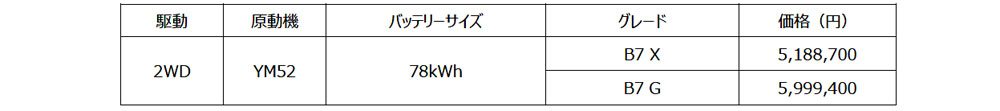 もうひとつ魅力があるのはバッテリーサイズが選択できることだ。B7とB5と呼ぶバッテリーサイズがあり、B7が78kWhでB5が55kWhの容量だ。航続距離ではB7が702km、B5は521kmとともに十分な航続距離がある。当然車両価格に反映されている。