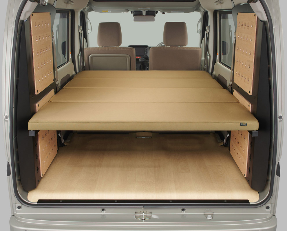 さらに、耐水性、撥水性に優れたCORDURAR製の生地を採用し、脱着や装着位置の高さが4段階調整できるベッドマットをオプション設定。車中泊仕様車としての使用も可能としている。有孔ボード、専用フロア、ベッドマットの色は、ナチュラルベージュのほかブラックも選択可能だ。
