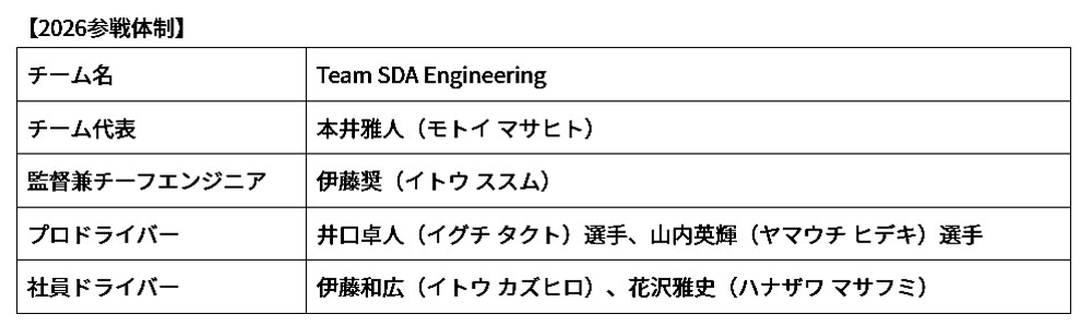 出場ドライバーは、プロドライバーの井口卓人選手、山内英輝選手の2名以外は技術部所属の社員ドライバーが担当する。