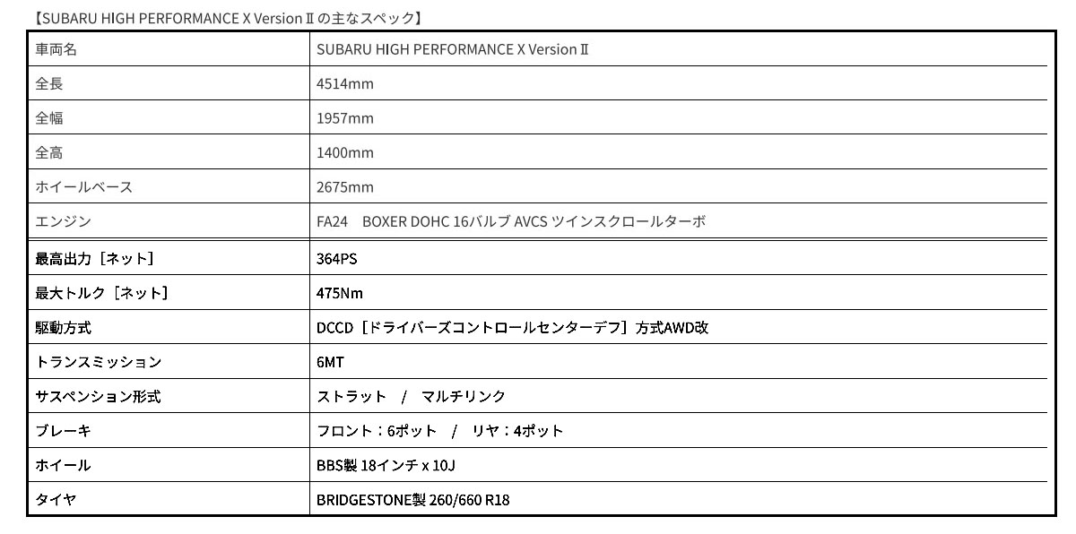 従来のスーパー耐久参戦車両「HIGH PERFORMANCE X FUTURE CONCEPT」と同様に、2.4Lの水平対向4気筒ターボエンジン「FA24型」とシンメトリカルAWD/DCCDセンターデフ、6速MTを採用。車両名は、これまで参戦車両の流れを汲み、「SUBARU HIGH PERFORMANCE X VersionⅡ」としている。