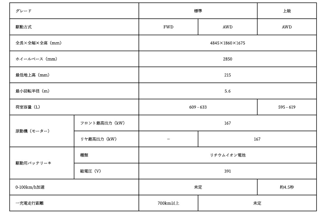 またモーターによる4WD制御などの先進技術を採用することで、意のままに操れる、感動の運転体験を提案するモデルとされている。