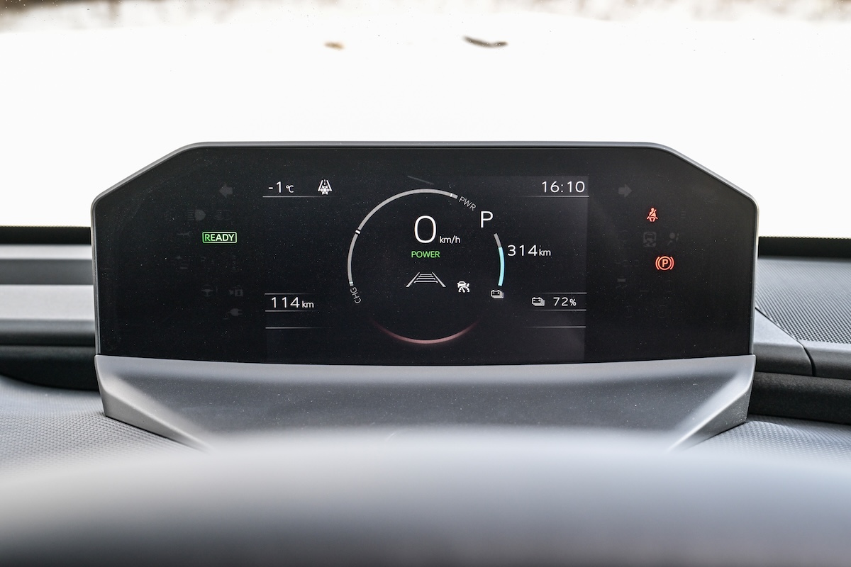 ドライブモードにはエコとノーマルとパワーモードが備わっているが、ノーマルが運転しやすかった。本来はエコモードがおすすめなのだろうが、ある程度車両姿勢のコントロールができるドライバーであれば、エコモードの反応の穏やかさはレスポンスが悪く感じてしまうかもしれない。またパワーモードはレスポンスが良すぎて、トルクが瞬間的に立ち上がるので、こうした滑りやすい路面では扱いにくい。