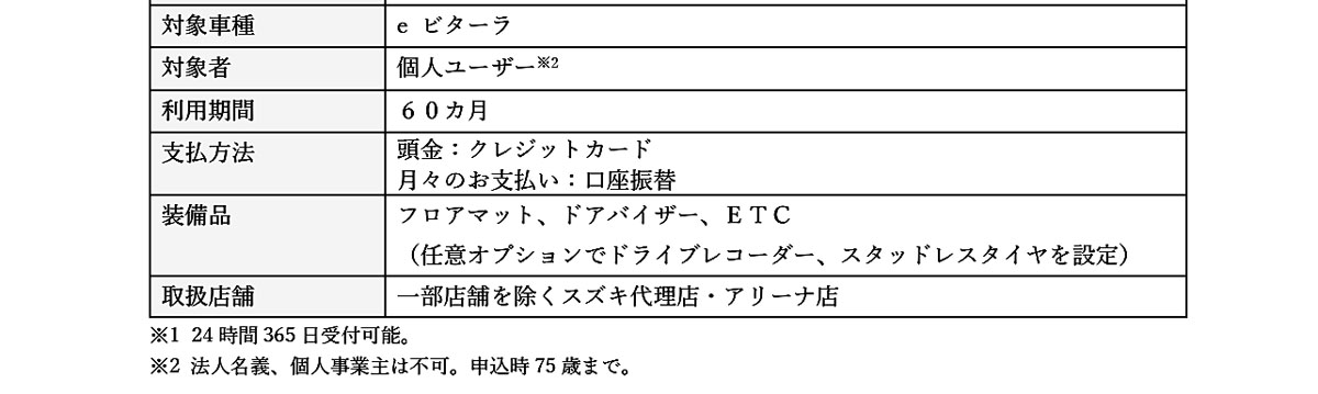 「スズキ定額マイカー5」は、車両代金・登録諸費用・車検を含むメンテナンス費用・各種税金・自動車保険料など5年間分をまとめて月々定額でクルマに乗ることができるサービスだ。対象車種は新型「e ビターラ」から提供を開始する。