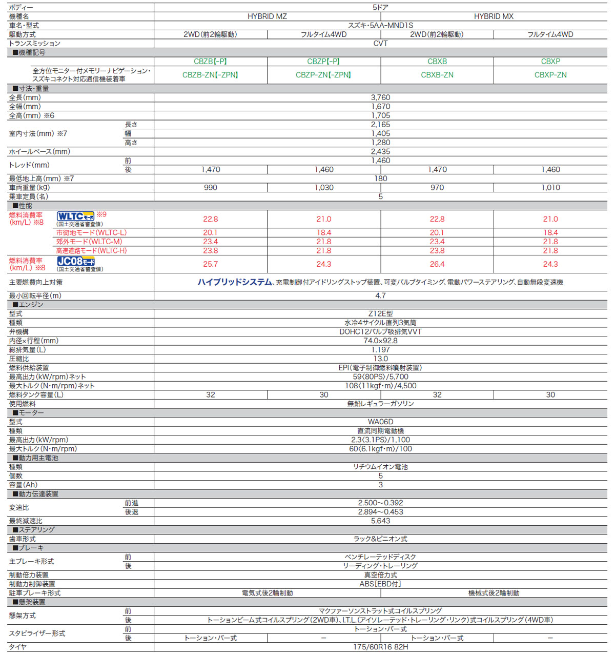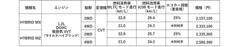 パワートレインは、スイフトやソリオに搭載しているZ12E型1.2Lの3気筒エンジン+マイルドハイブリッドとCVTを組み合わせて採用。Z12E型エンジンは80ps/108Nmを発生し、WLTCモード燃費は2WDで22.8km/L、4WDで21.0km/Lとなっている。