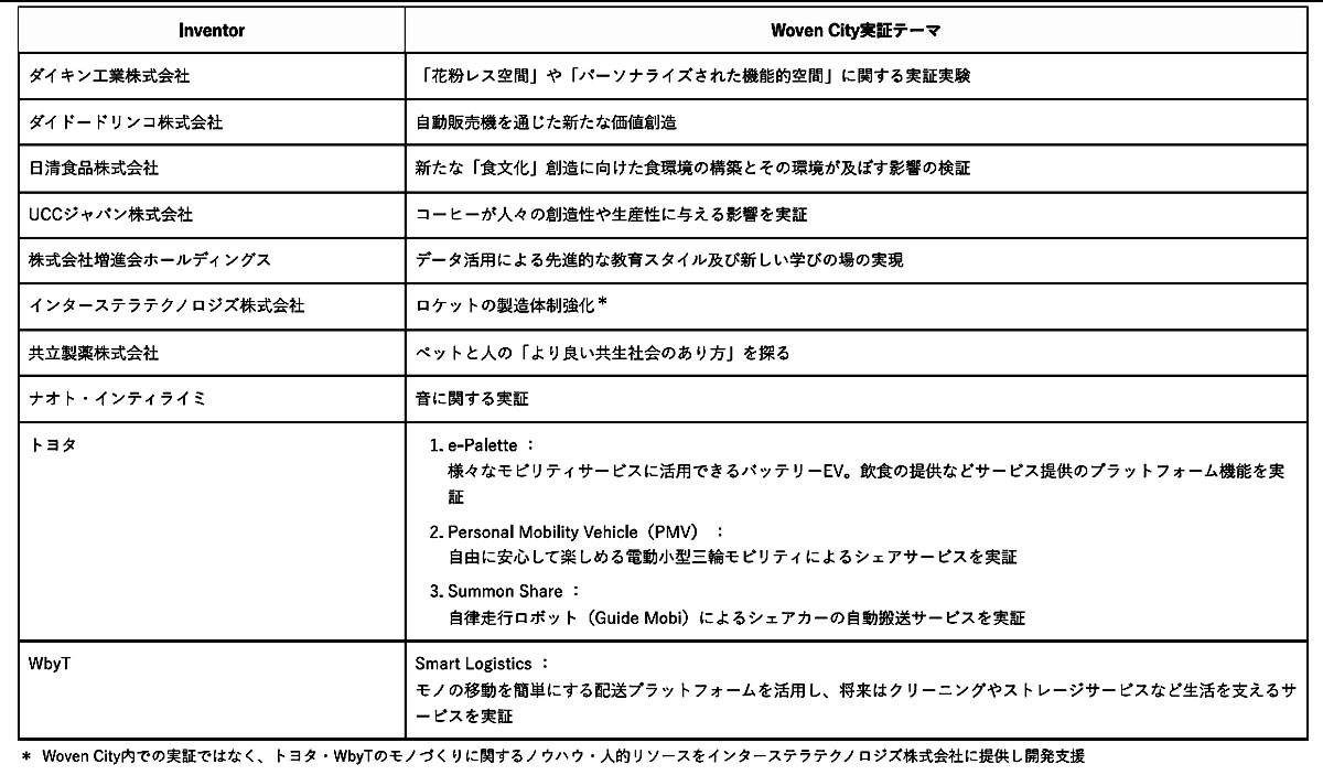 ウーブンシティでは、新しいプロダクトやサービスを開発・実証する企業・個人は、Inventors(インベンター:発明家)と呼ばれる。トヨタのものづくりの知見やウーブン・バイ・トヨタのソフトウェア技術、そして各発明家が持つ様々な強みや専門性などを融合させることで、いまは存在しない価値を生み出すことが実証実験の目的とされている。