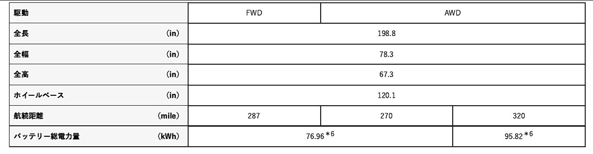 搭載するリチウムイオン・バッテリーは、標準の容量76.96kWh仕様と、長距離移動やアウトドア向けに航続距離向上を目指した容量95.82kWh仕様をラインアップ。駆動方式は前輪駆動(FWD)タイプ、全輪駆動(AWD)タイプを設定している。