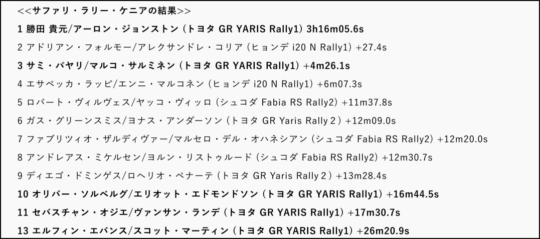 今回の勝田の勝利により、トヨタGAZOOレーシングワールドラリーチームはサファリ・ラリーが2021年にWRCのシリーズに復活してから負けなしの6連覇を達成。トヨタとしては通算14回目のサファリ・ラリー制覇となっている。