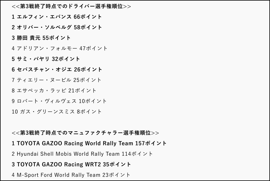 このラリーでデイ2時点では勝田/ジョンストン組は7番手につけており、同じトヨタGAZOOレーシングワールドラリーチームのオリバー・ソルベルグ/エリオット・エドモンドソン組が1位、セバスチャン・オジエ/ヴァンサン・ランデ組が2位、エルフィン・エバンス/スコット・マーティン組が3位と上位を独占していた。