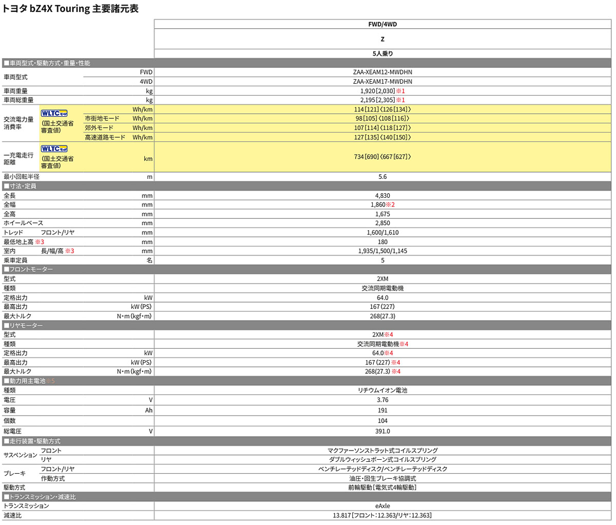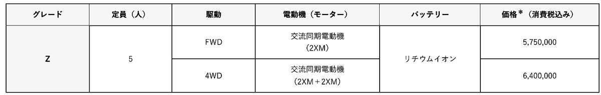 新型「bZ4X ツーリング」は5人乗りで、「Z」グレードのみでFFと4WDが設定されている。なおこの「bZ4X ツーリング」はスバル「トレイルシーカー」と共通モデルであり、生産はスバルの矢島工場の新混流ラインで行なわれる。