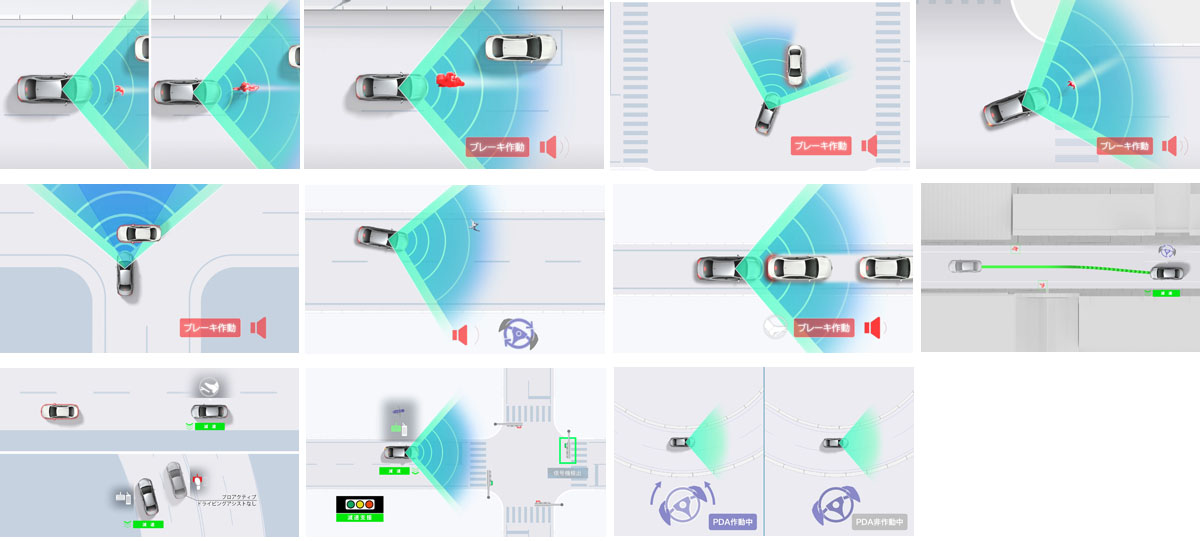 また「プロアクティブドライビングアシスト」機能は、運転の状況に応じたリスクの先読みを行なうことで、歩行者や自転車、駐車車両に近づきすぎないようにステアリング/ブレーキ操作をサポートすることができる。さらに、先行車や前方のカーブに対しても必要に応じて減速操作を行ない、ペダルの踏みかえ頻度を抑えられるようにしている。