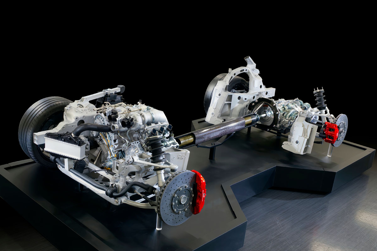 日産GT-Rと同様にトランスアクスルを採用しているのは重量配分を最適化するためであることはいうまでもない。