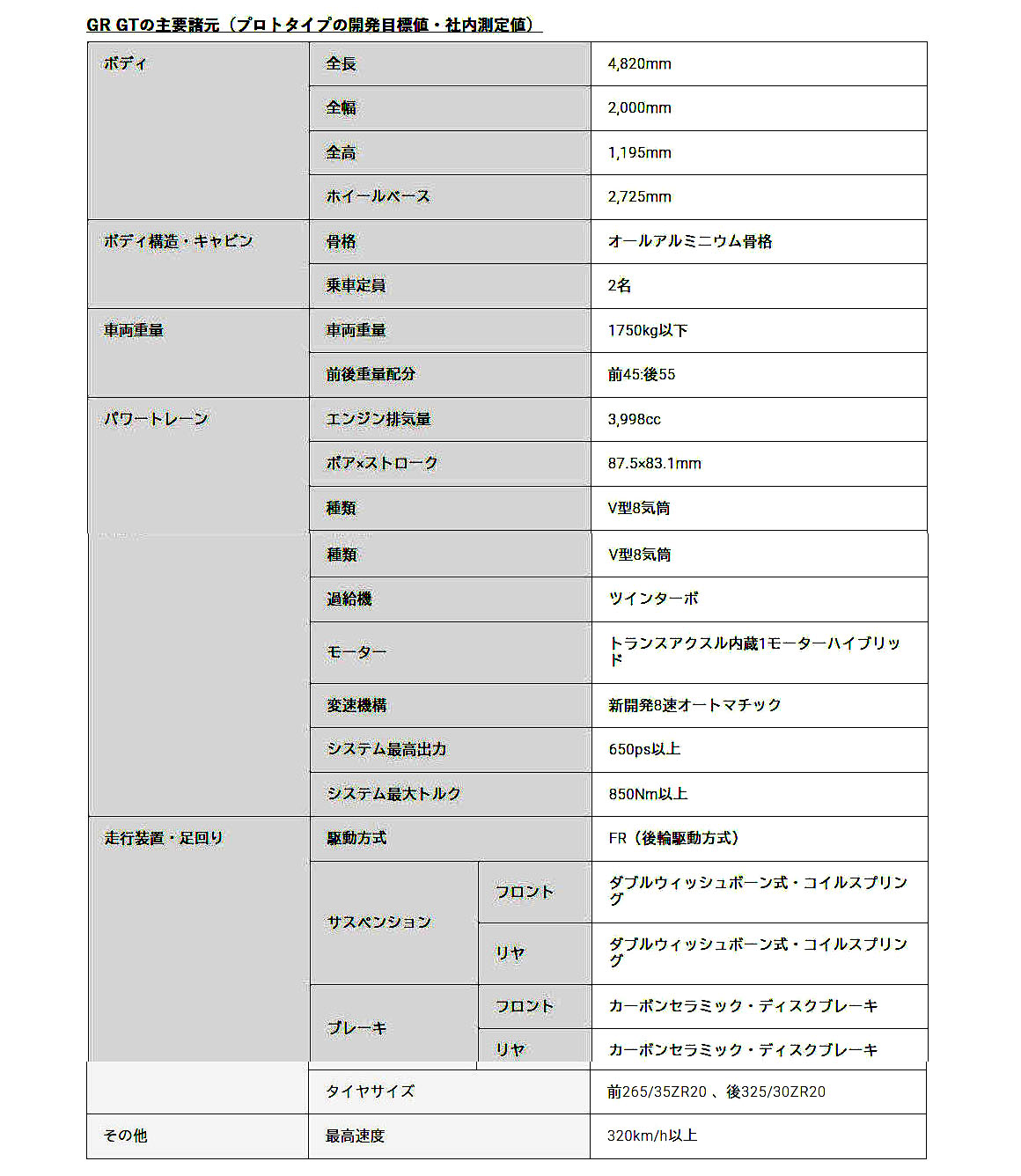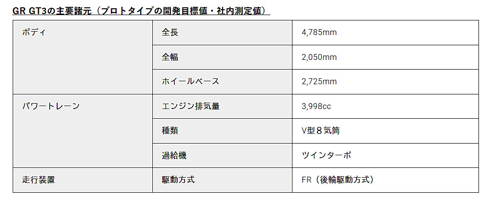 今回披露された「GR GT」、そしてFIA GT3規格のレース仕様車「GR GT3」はプロトタイプとされているが量産モデルはハンドメイドによる極めて少量生産であり、価格は超高価格になると推測されている。市場へのデビューは2027年と想定される。