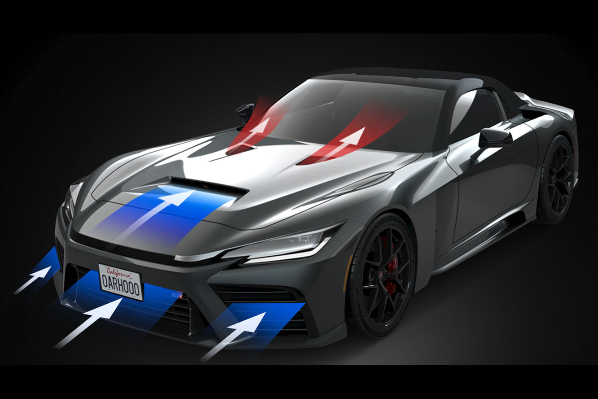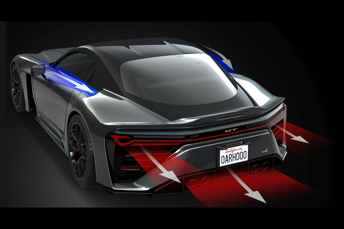 エクステリアは、空力性能の追求のため、これまでのクルマづくりとは異なるプロセスを採用。通常の車両開発ではクルマの外装デザインを決めてから空力性能を検討するという手順となるが、「GR GT」では空力性能の理想像を定めてからデザインの検討を進め、空力設計担当者とエクステリアデザイナーが一丸となって、空力・冷却性能を追求するデザインとしている。ボディは、ロングノーズ、スモールキャビン、ショートデッキというクラシックなフォルムだ。