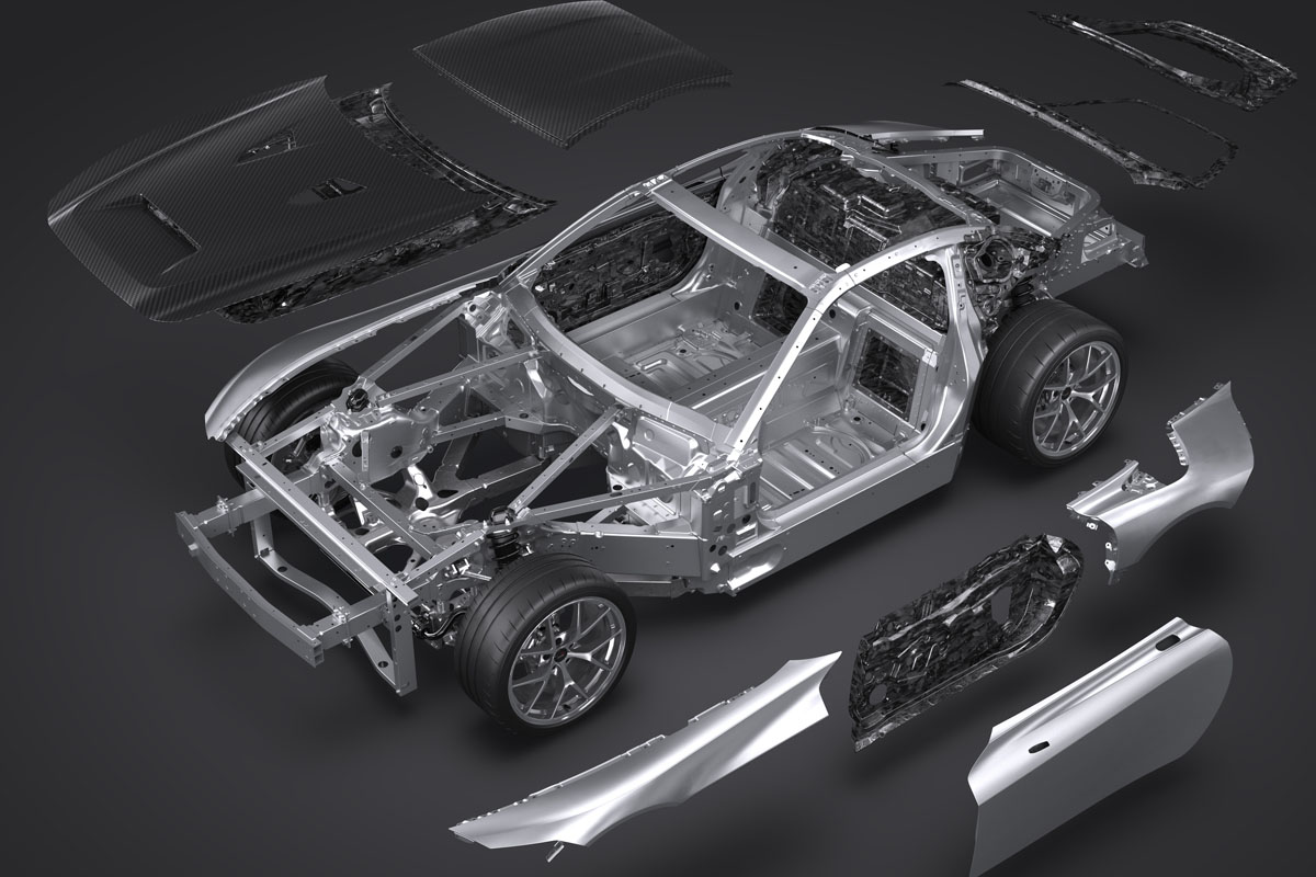 そして軽量・高剛性の実現のため、トヨタで初めてオールアルミニウム骨格を採用している。モノコックセル+前後スペースフレーム的な骨格構造となっている。ボディパネルはカーボンや樹脂など様々な素材を適材適所に使用し、軽量・高強度化している。