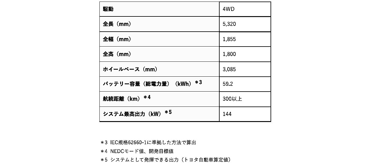 バッテリーパックはフレーム幅を最大限生かしつつ床下に収まるように搭載。そして前後に高出力タイプのeアクスルを採用した4WDとし、システム最高出力144kW(196ps)を発揮するとともに、進化した制御システムにより優れた悪路走破性を実現しているという。