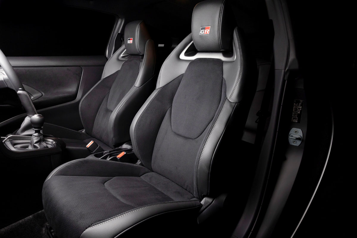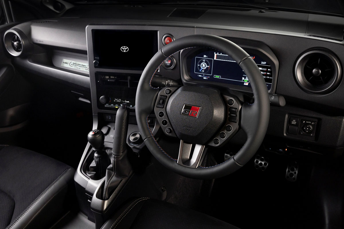 操作性を重視したステアリングホイールは、外形をひとまわり小径化し、またステアリングスイッチは「GRヤリス ラリー2」に着想し、各種スイッチが独立した形状に変更されている。ステッチにはブルー、グレー、レッドのトリコロール仕上げとなっている。