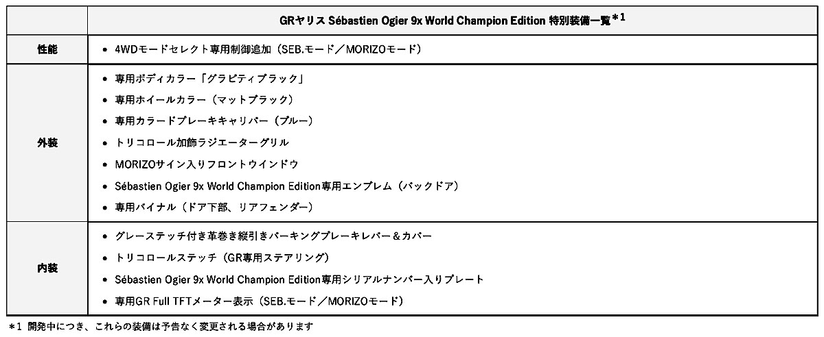 2025年に発売した「GRヤリス Aero performance package」をベースに、オジエ選手と共同チューニングした4駆制御「SEB.」モード、オジエ選手のこだわったエクステリアとインテリアの仕上げ、TGRのモータースポーツ活動を象徴するボディカラー「グラビティブラック」などの専用装備を採用している。