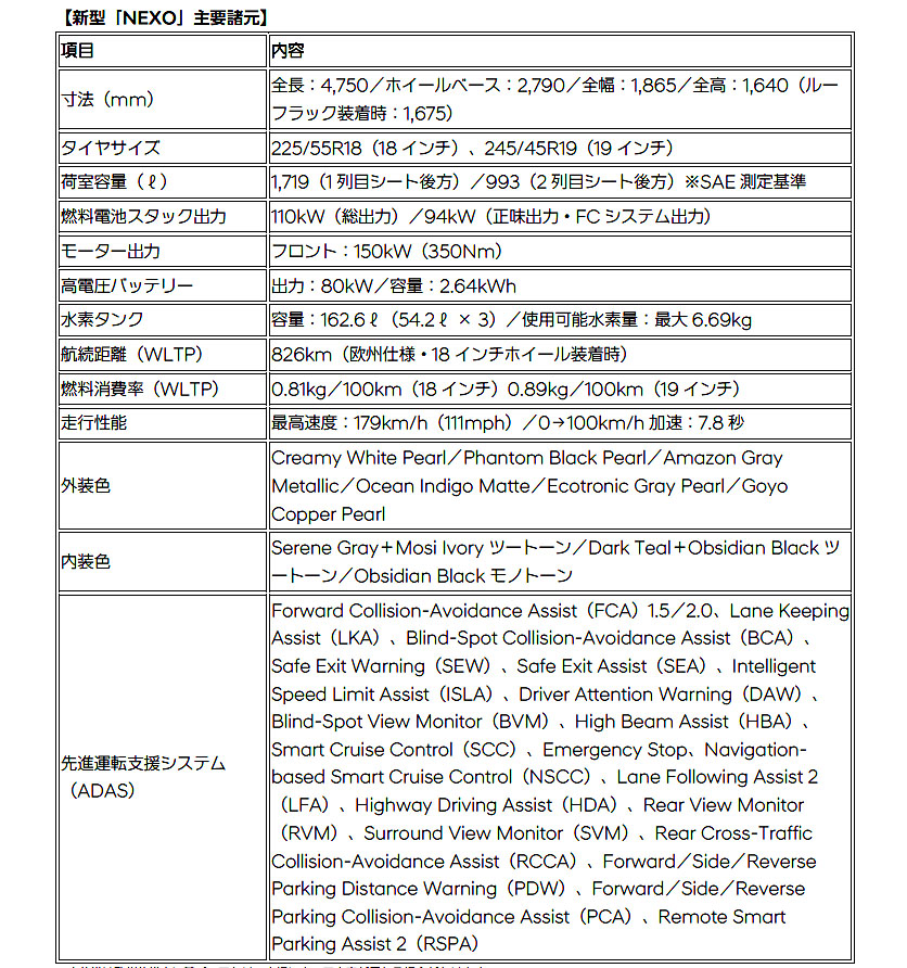 今回発売される新型「NEXO」は2代目モデルになる。ヒョンデの市販燃料電池車の原点は2013年に発売された「ツーソン FCEV」から始まっている。グローバルで見て水素を燃料とする燃料電池車は2000年にフォードがフォーカスFCV,2002年にホンダがFCX,トヨタはFCHVを限定的にリース車として市場に送り出し、その他の自動車メーカーも少数の燃料電池車を限定的にリース車として世に出している。