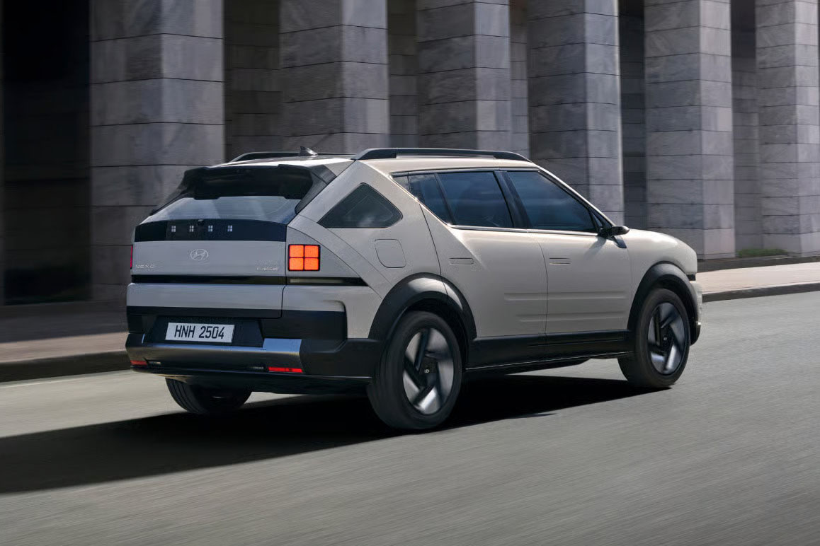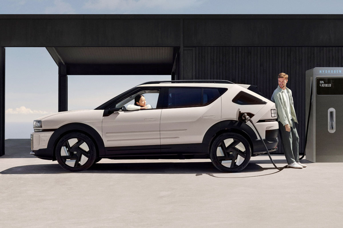 さらに、フロントのデイタイムランニングライト(DRL)とリヤランプには、ヒョンデの水素バリューチェーン事業ブランド「HTWO」のシンボルをモチーフにしたデザイン要素を採用。ブランドのビジョンと技術力を象徴するディテールとして、視覚的な個性を際立たせている。