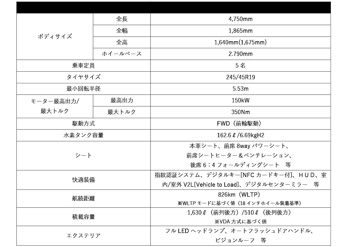 発電を行なう水素燃料電池スタック(FCスタック)の最高総出力は、従来比16%増の110kWとなり、新型電気モーターは最大150kWの出力を発揮することができる。さらに、水素タンク容量は先代モデルの6.33kgから6.69kgへと増加し、燃料貯蔵密度の向上とともに充填頻度の低減を両立。航続距離はWLTP基準で最大826kmを達成し、日常使いから長距離移動までオールラウンドに使用することができる。