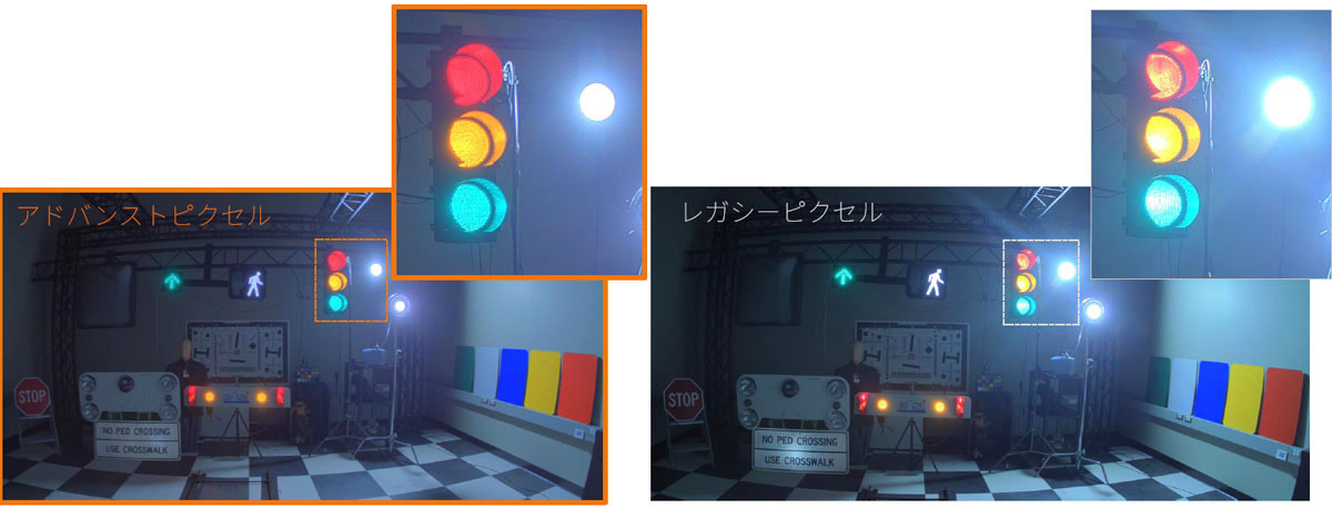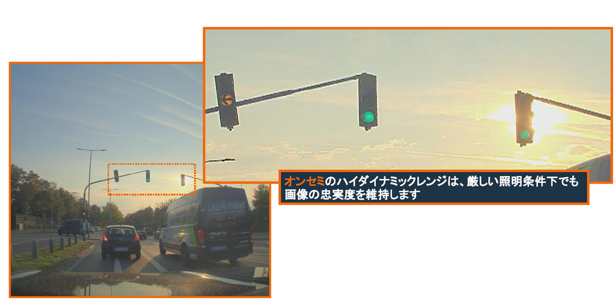車載カメラ用のイメージセンサーは、通常のカメラ用とは異なり、逆光、西日、トンネルの通過などの悪条件化での高コントラスト性、暗い環境での認識性、信号機などに用いられるLED表示の色を正確に捉えるLEDフリッカー対応性、幅広い温度環境で動作する堅牢性などが求められている。