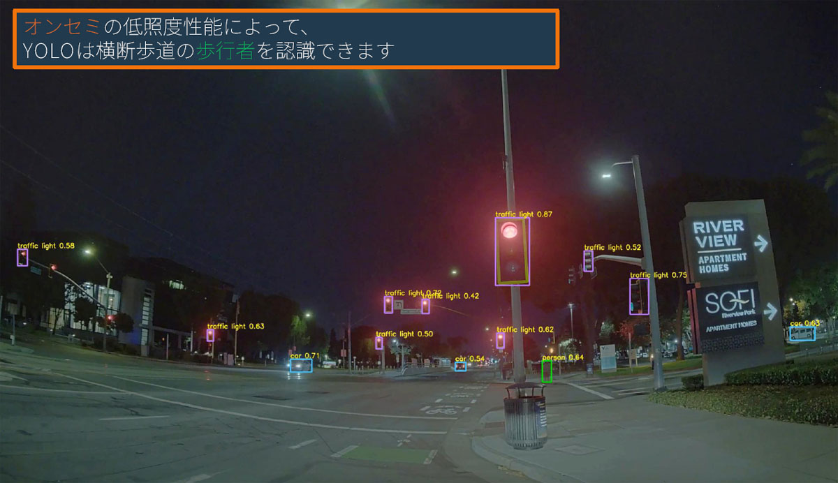 暗い環境での認識性では、0.3ルーメン(満月の状態)はもちろん、0.1ルーメン(三日月の状態)でも歩行者や自転車が検知でき、また、低照度のトンネルから前方の明るい風景を見た場合でも環境検知ができる性能を備えている。