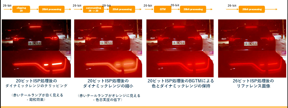 そして現在は26ビット映像を20ビットに圧縮可能なアルゴリズムを内蔵するイメージセンサーを開発している。最大150dbの明暗差を捉えられるダイナミックレンジを持つイメージセンサー「ベイヤーグローバルトーンマッピング(BGTM)」であるが、センサーが収集する生データ(RAWデータ)はデータ容量が大きすぎるため、既存の20ビットや24ビットの画像処理SoCでは処理できない場合がある。