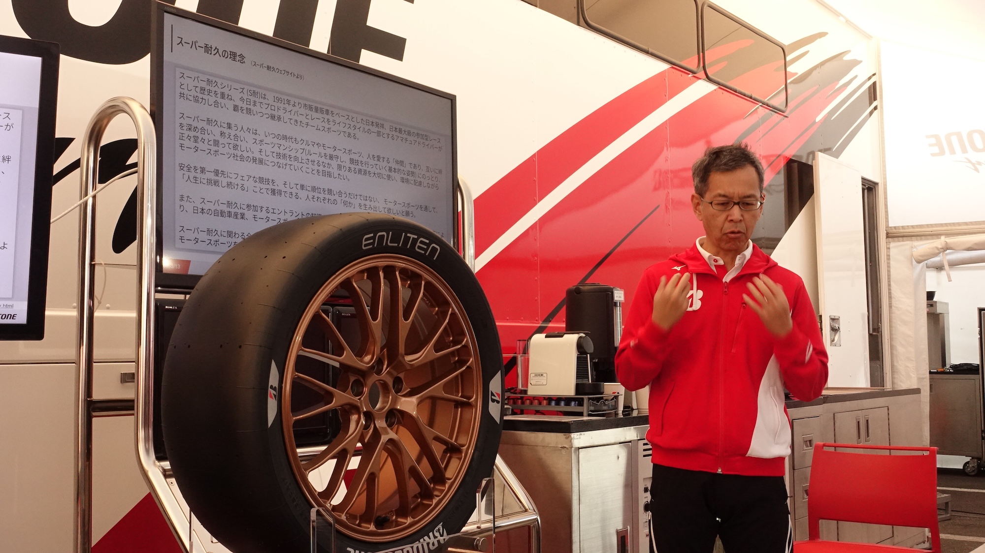 タイヤはST-Qクラスに参戦している#12号車ロードスターと#28号車GR86の2台に供給している。そして今回のテスト投入に先立ち、ブリヂストンのグローバルモータースポーツ管掌の常務役員今井弘さんからプレゼンテーションが行なわれた。