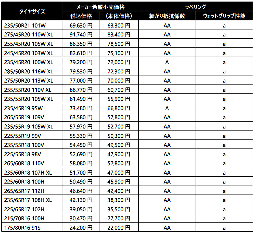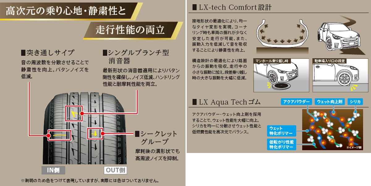 ゴム部の配合は、ウェット路面に適合する「アクアパウダー」とウェット向上剤を採用した「LX Aqua Techゴム」を採用し、ウェット性能を大幅に向上。ウェットブレーキ制動距離は、従来品対比15%短縮、ウェットグリップ性能は全サイズ「a」グレードを達成している。