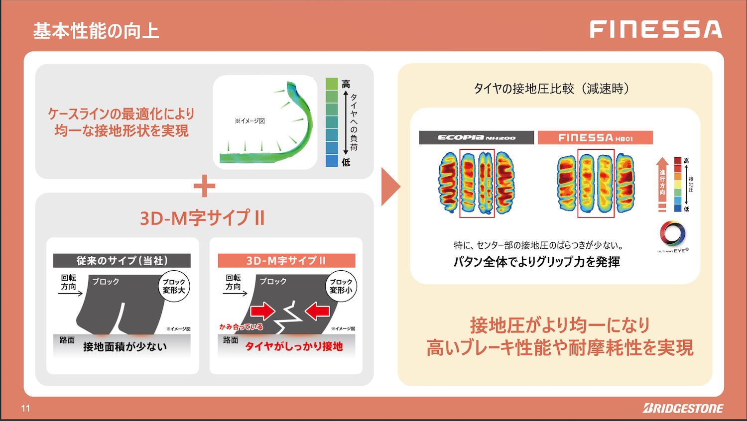こうした性能は、大きく分けて4つの技術で作られている。まず3D-M字サイプⅡは、サイプ形状により、ブロック剛性が上がり、変形が小さくなる。さらにエンライトンにより均一な接地形状もあって、減速時の接地圧が向上しているのだ。