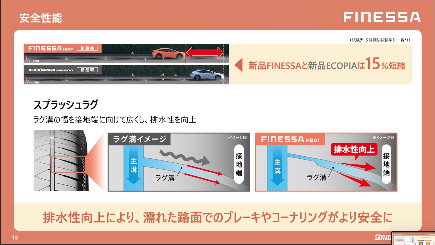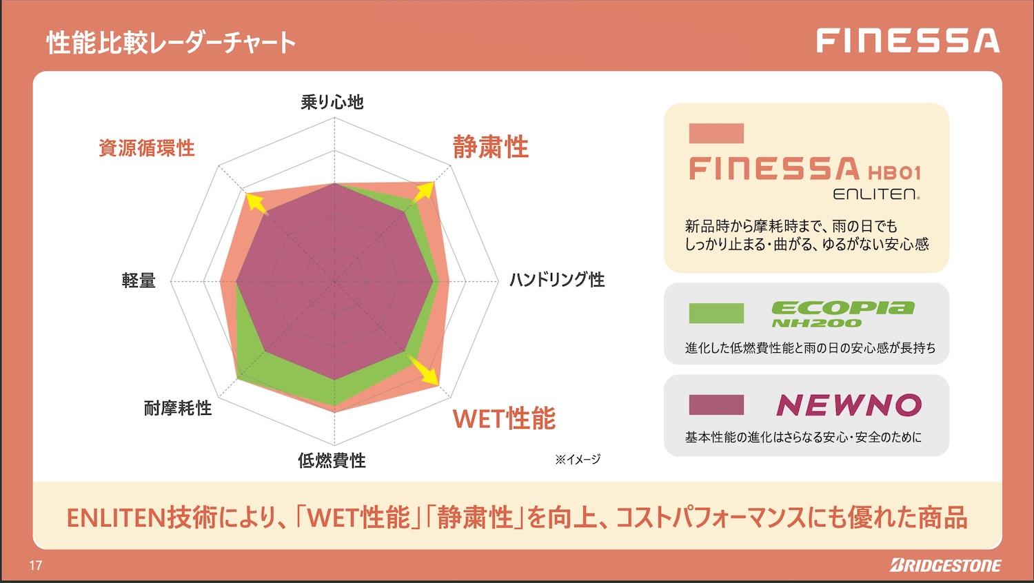 総合性能ではブリヂストンのスタンダードタイヤにはニューモとエコピアがあり、新規にこのフィネッサHB01が加わったが、資源循環性も含め、すべての評価領域でフィネッサHB01がもっとも高性能なタイヤということができ、コストパフォーマンスではワンランク上の新商品ということができるだろう。