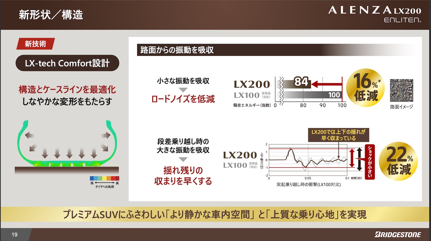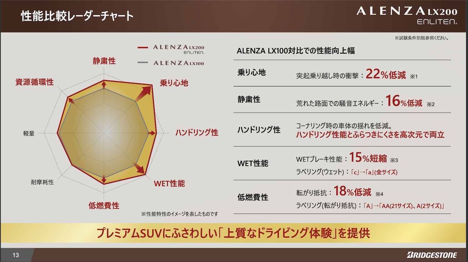 ブリヂストンのSUV向けプレミアム・コンフォートタイヤ「アレンザ」の第2世代がデビューした。初代のアレンザLX100の後継モデル「アレンザLX200」は、ブリヂストンのタイヤ基盤技術であるENLITEN(エンライトン)をベースに、より上質な乗り心地や静粛性を高めて登場した。
