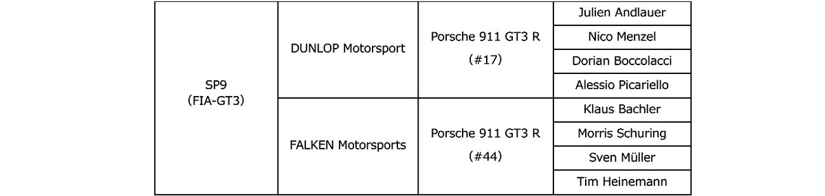 住友ゴムは、コミュニケーションブランドを「ダンロップ」に統一し、グローバル市場におけるプレミアム・ブランドとしてブランド価値向上戦略の一環として、ニュルブルクリンク24時間レースおよびNLS(ニュルブルクリンク耐久レース)に参戦する。