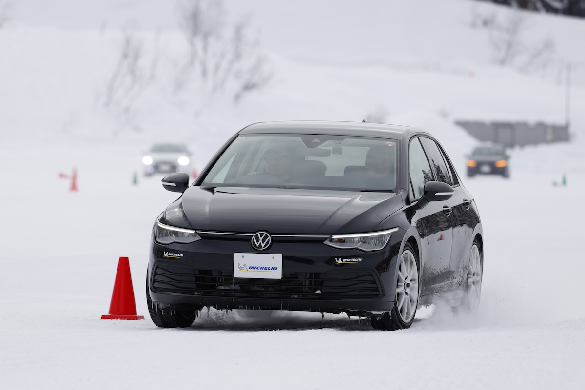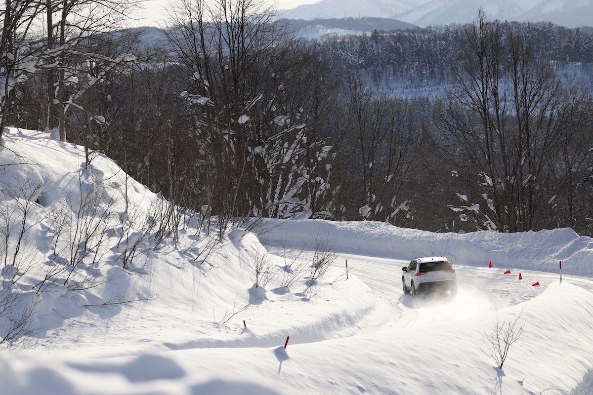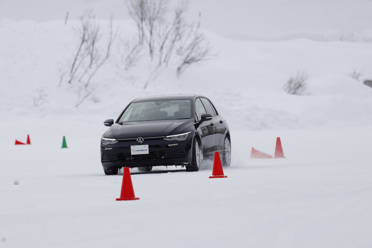 まずはテストコースのレイアウトとして氷盤路での制動テストを行ない、そのまま40km/hでスラローム。ここから先は全て圧雪路の状態で、完全な雪道をイメージしてもらえば良い。スラロームを終えて下り坂を50km/hに速度を上げてレーンチェンジを行なう。最後は50km/hでの急ブレーキテストというコースだ。その後、コースを変更し、定常円旋回、ワインディング路の走行を行ない終了というメニューだった。
